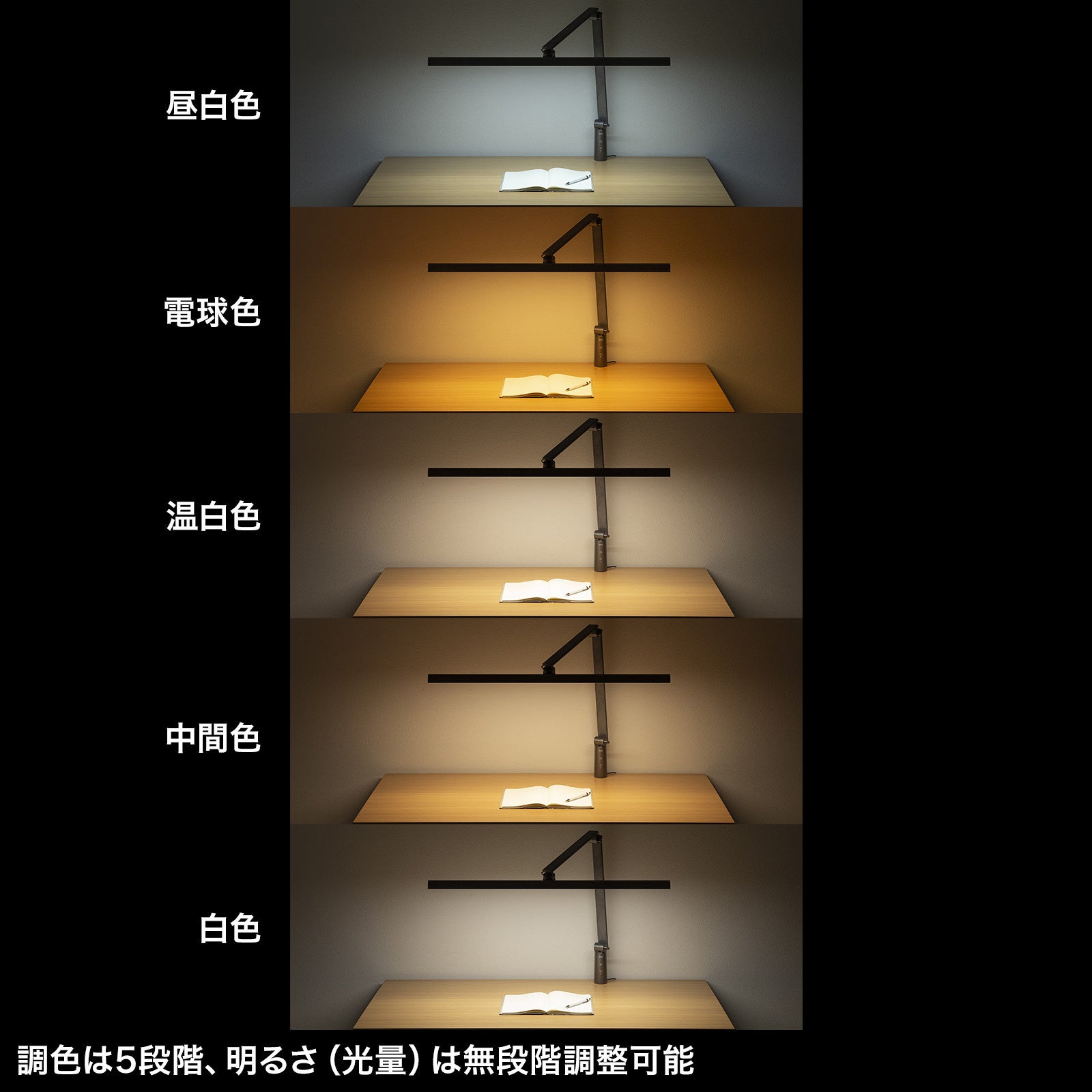 明るさは無段階、色は5段階で調整できるので、使用シーンや用途に合わせて最適な明るさを選べます。