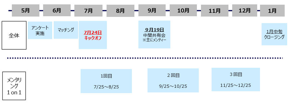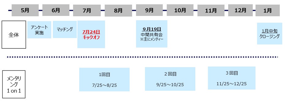 昨年度は、2022年度に経済産業省が実施した「企業横断型メンタリングプログラム」をきっかけとし、アデコ、パナソニック コネクト、ルネサンスの3社で実施いたしました。実施後アンケートにおいて、メンティーは一つ上の職位を担うことへの自信の高まりがみられたこと、メンターも企業の枠を超えた人材育成が自身の成長機会にも繋がったことなど、このプログラムにおいて期待する効果がみられたことにより、今年度はイオン、シチズン時計とともに5社に拡大展開いたします。7月24日のキックオフより、3回のメンタリング、中間共有会を経て、1月のクロージングまで、約7カ月間のプログラムを実施してまいります。