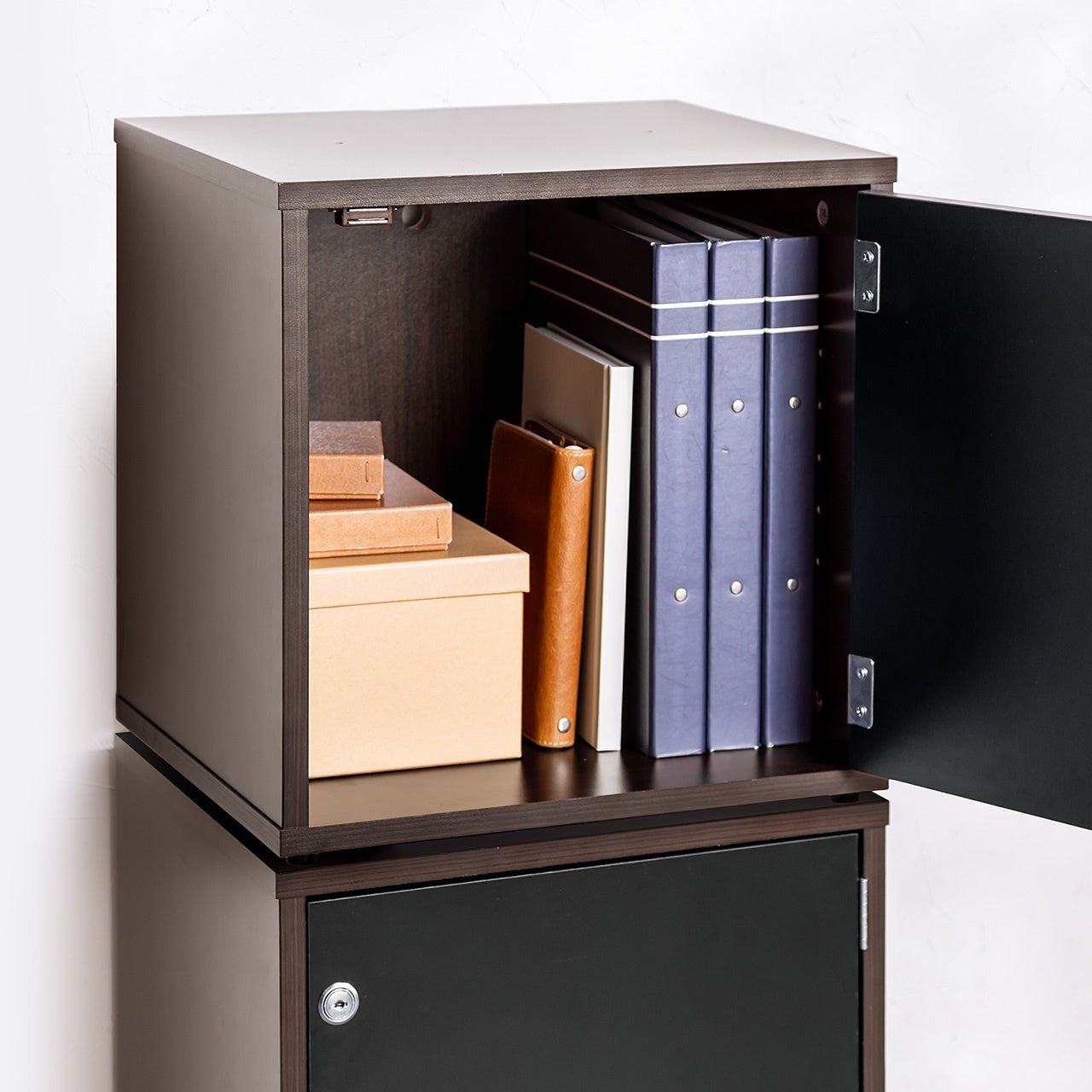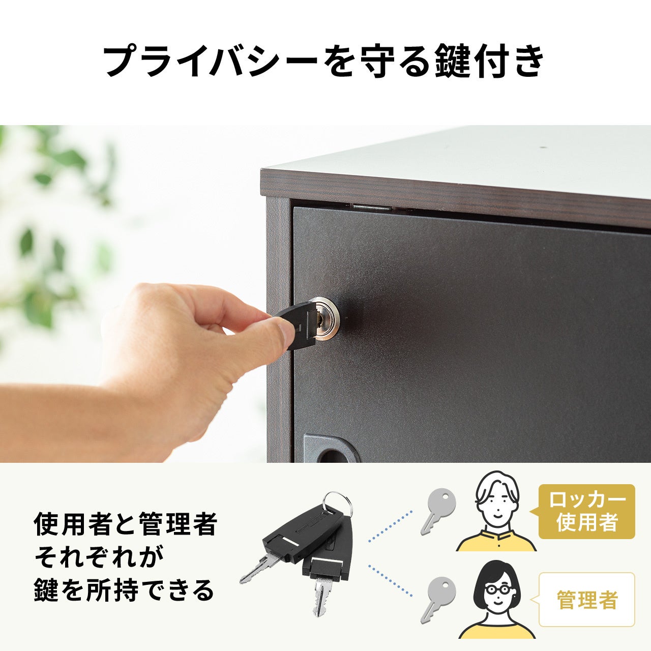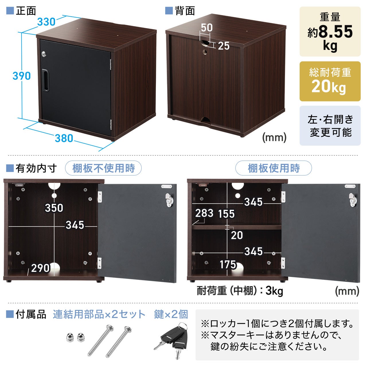 棚板が1枚標準装備しています。鍵が2本付属し、セキュリティ対策が可能です。