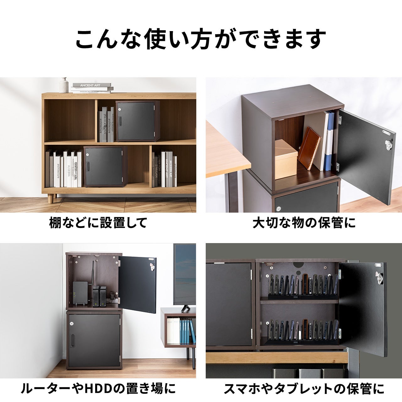 セキュリティボックス キューブボックス 鍵付き 木製 小型 ロッカー スタッキング可能 簡単組立 A4 書類 Wi-Fiルーター HDD 収納 セキュリティワイヤー対応