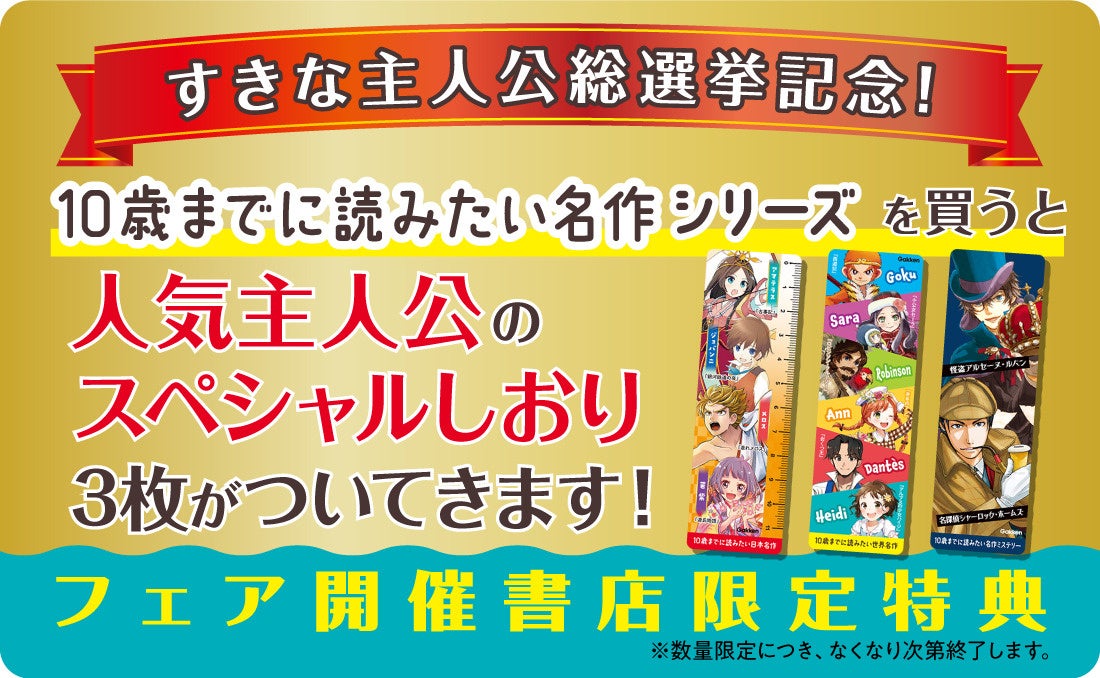 株式会社 学研ホールディングス(東京・品川/代表取締役社長:宮原博昭)のグループ会社、株式会社 Gakken(東京・品川/代表取締役社長:五郎丸 徹)が発行する児童書「10歳までに読みたい名作」シリーズでは、“みんながえらぶ すきな主人公総選挙”を開催しました。その結果を発表いたします。