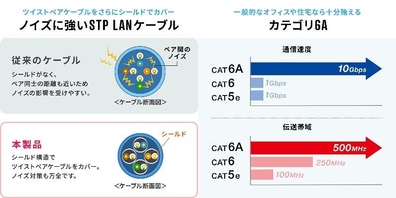 超高速の10ギガビット・イーサネット(10GBASE-T)環境に対応し、伝送帯域は500MHzと広く、エンハンスドカテゴリ5の5.0倍、カテゴリ6の2.0倍の伝送帯域を実現しています。伝送帯域が広いので高速伝送が可能で、データエラー防止に効果があります。50μm金メッキピンRJ-45コネクタを採用、信頼性の高い高速通信が可能です。