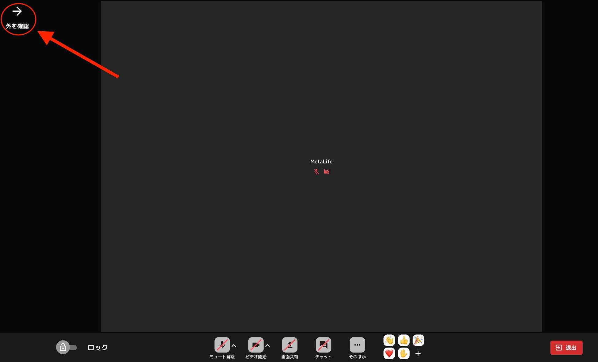 左上にある「外を確認」ボタンを押すことでスペース内の様子を確認することができます。