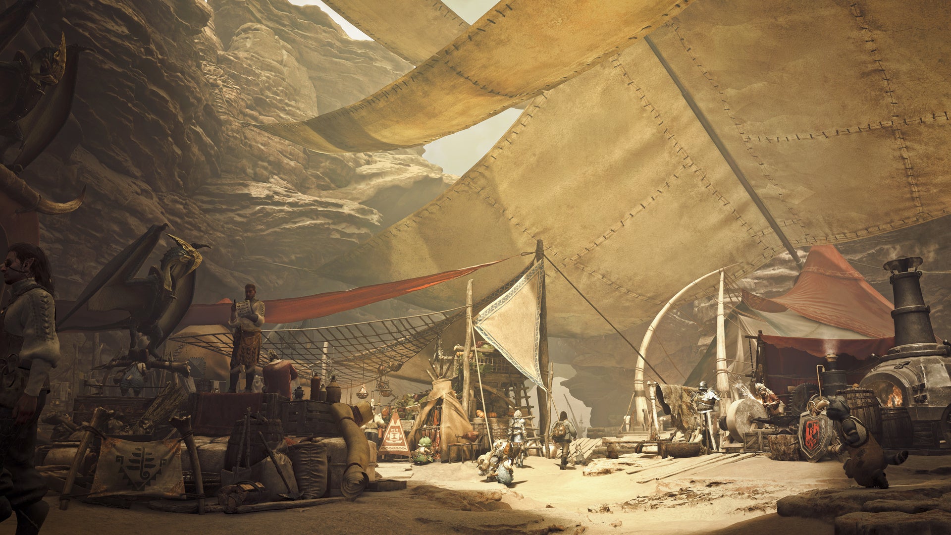 ハンター自身のテントの他、アイテムの購入や食材の配給、武器や防具を作ってくれる加工屋など、狩りに必要な設備が整っている。