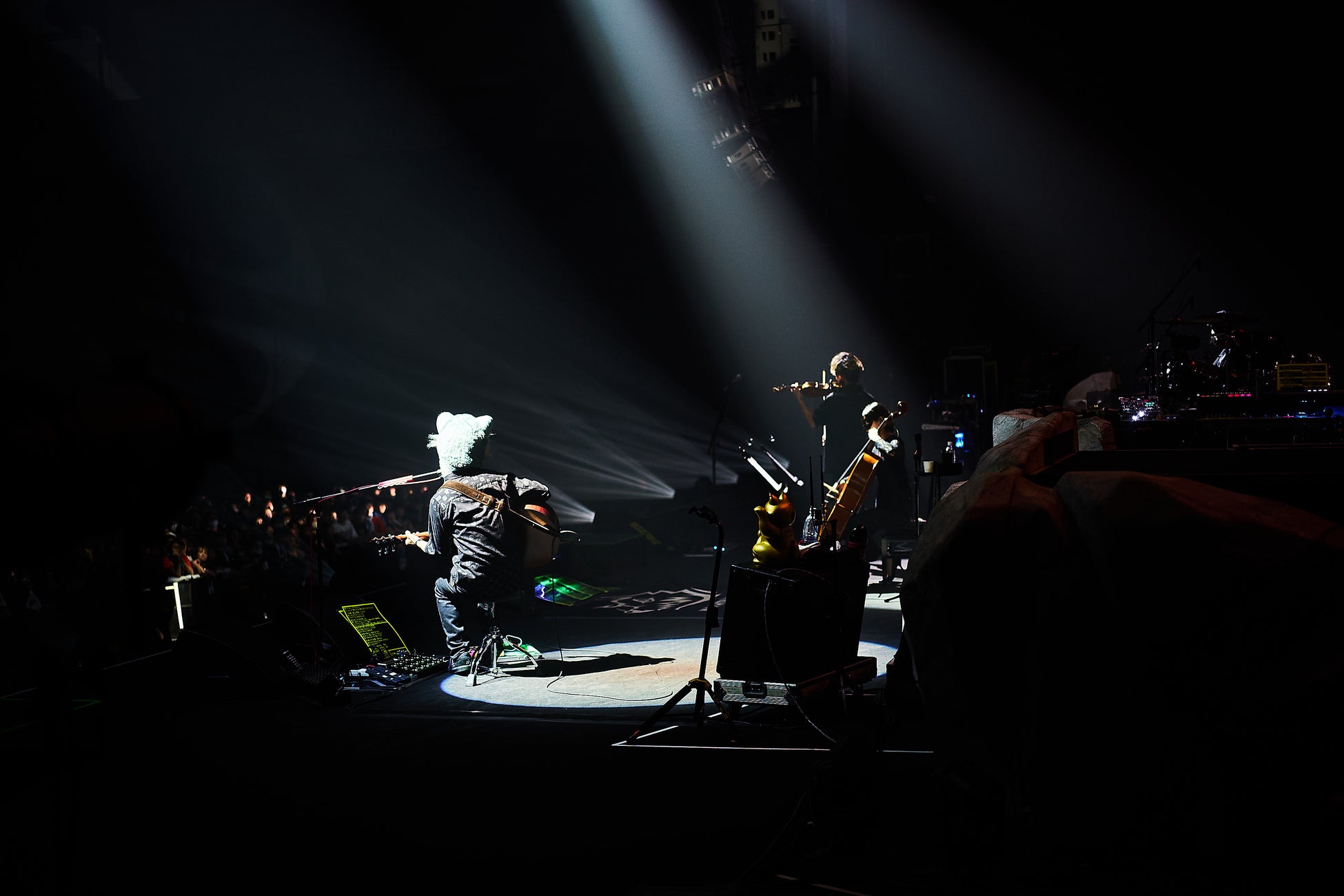 最終日となった石川公演はツアー各地でも披露されてきた「When My Devil Rises」から幕開け。ステージに大きくそびえ立つ5匹のオオカミの巨大オブジェが煌々と照らし出され、その瞳からは激しくレーザーを放つ。オールスタンディングの場内では観客が思い思いに体を揺らし、続く「distance」で一気に熱気に包まれた。Jean-Ken Johnnyの「本日ハツアーファイナル、追加公演!最終目的地ガココ金沢デゴザイマス。ヤレル準備ハデキテルカ?思ウ存分遊ンデイケー!」という雄叫びに続く楽曲はツアー開始直前にこの世に放たれた2025年新曲「REACHING FOR THE SKY」。12公演を通して紡がれ、力強い骨太なサウンドが増している。さらに「database」「1997」と繰り広げたあとは、バンドスタッフによるリクエスト楽曲。ツアー会場ごとにゆかりのスタッフ達のリクエストも演奏するというもので、この日は最新作「XV e.p.」から「Circles」がピックアップされた。思わぬ形で最終日にライブ初披露されることとなり、大きな歓声が沸いた。その後、「Emotions」のイントロが流れるとメンバーの後方には狼のマスカレードマスクで顔を覆ったストリングス隊が姿を表した。バンドサウンドに繊細ながらに豪傑なドラマチックな音が重なっていく。