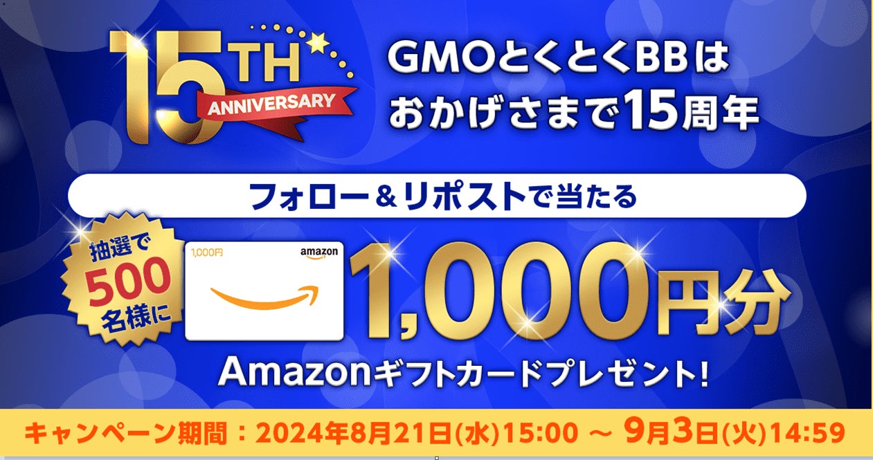 GMOインターネットグループ株式会社(代表取締役グループ代表:熊谷 正寿)は、お得なプロバイダーサービス「GMOとくとくBB」(URL:https://gmobb.jp/) のサービス開始15周年を記念し、2024年8月7日(水)より「15周年大感謝キャンペーン」を開始しました。
