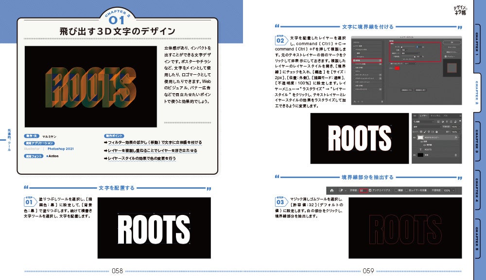 本書は、その中でも多くの人にとっての課題となる「文字デザイン」にフォーカスし、さまざまな業界・業種のデザインワークをおこなっている7人のプロフェッショナルが、いますぐ使える手法や効果を実践的な作例を使い、効果的な文字デザインの作り方を丁寧に解説しています。紙面に掲載の作例のサンプルデータはダウンロードできるので、合わせて学習に活用できます。