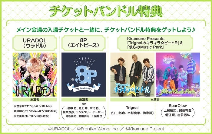 また入場チケットと一緒に購入できるチケットバンドル特典の出演者情報も公開され、URADOL(ウラドル)から伊住京章/ケイくん(CV:KENN)・藤崎蘭万/ランちゃん(CV:前野智昭)・宇佐美累/ルイ(CV:羽多野渉)、8P(エイトピース)から8P(畠中 祐、野上 翔、八代 拓、榎木淳弥、ランズベリー・アーサー、髙坂篤志、益山武明、千葉翔也)、Kiramune Presents「Trignalのキラキラ☆ビートR」&「僕らのMusic Park」からTrignal(江口拓也、木村良平、代永翼)・SparQlew(上村祐翔、保住有哉、堀江瞬、吉永拓斗)を予定しています。