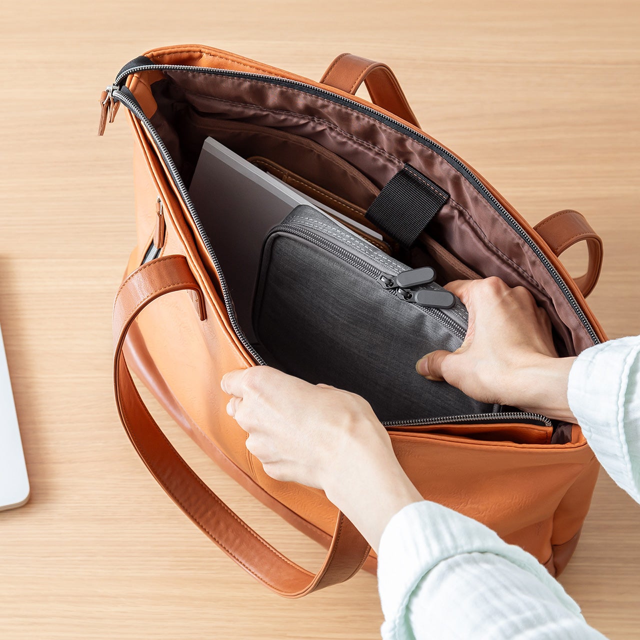 本製品は、ファスナーポケットとゴムベルトで小物を整理収納できます。