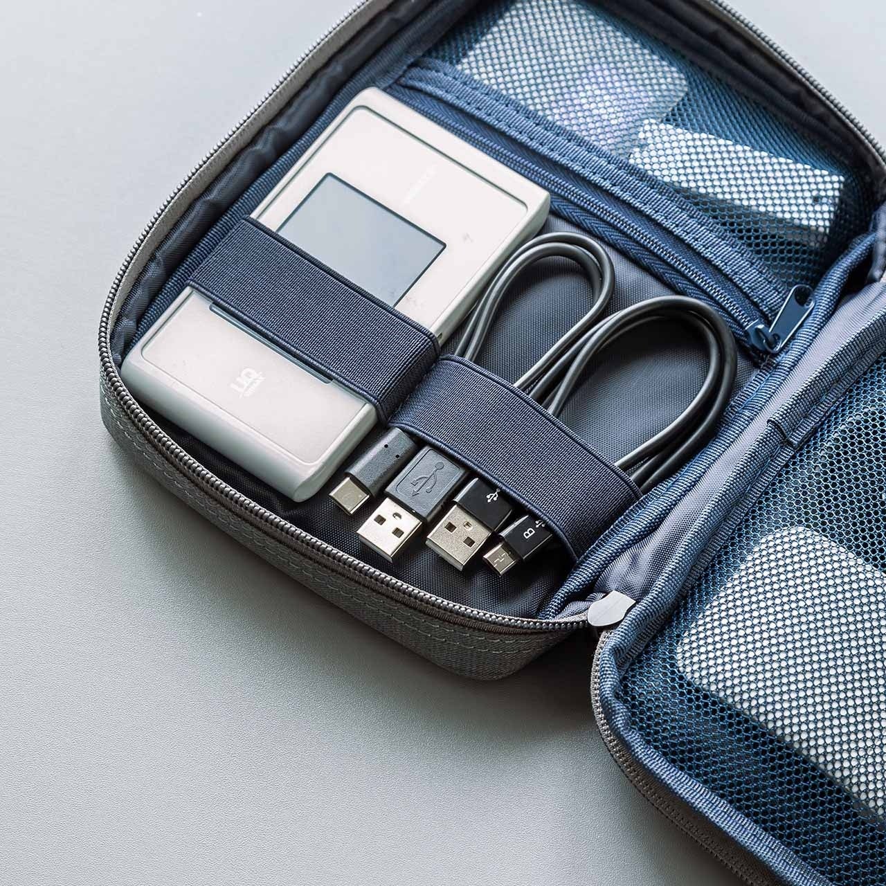ガジェットポーチ 薄型 ガジェットケース ケーブル収納 トラベルケース ゴムバンド固定 Mサイズ グレー