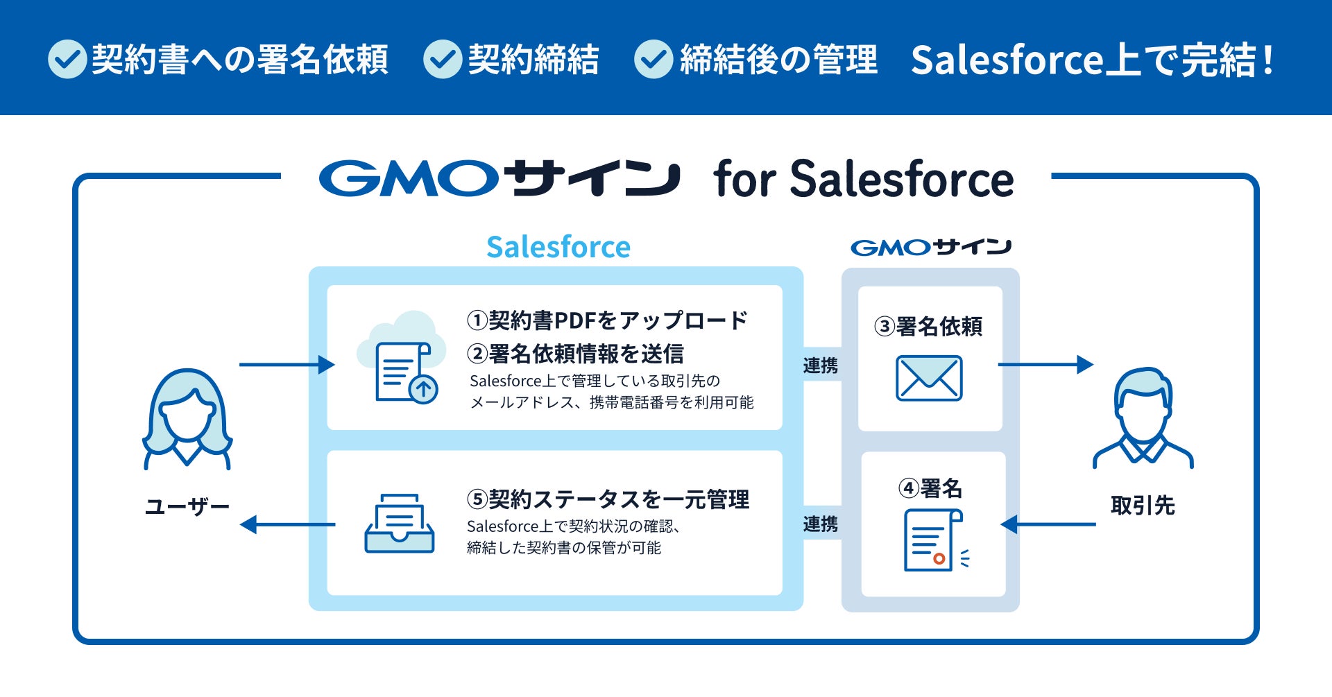 「GMOサイン for Salesforce」では、「Salesforce」上で管理している取引先のメールアドレス、携帯電話番号を用いて「GMOサイン」から署名依頼を送ることができます。さらに、署名依頼の送信、受信等の契約ステータスが取引先情報と自動で紐づくため、契約業務に関する全てのアクションを「Salesforce」上で管理することが可能です。
