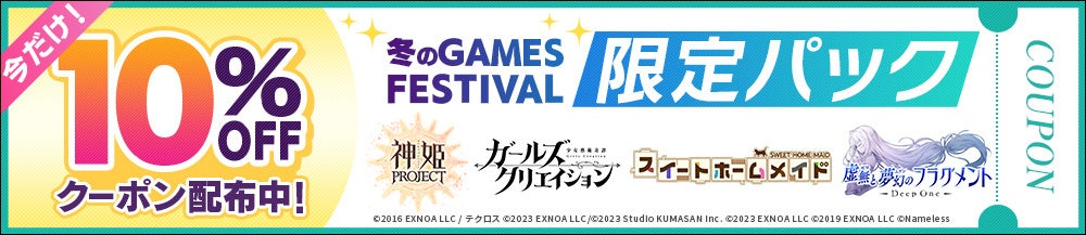 特定のゲーム内アイテムが10%OFFとお得に購入できる特別クーポンを配付します。今年サービス開始した『ガールズクリエイション -少女藝術綺譚-』や『スイートホームメイド』も対象なのでこの機会に遊んでみてください!