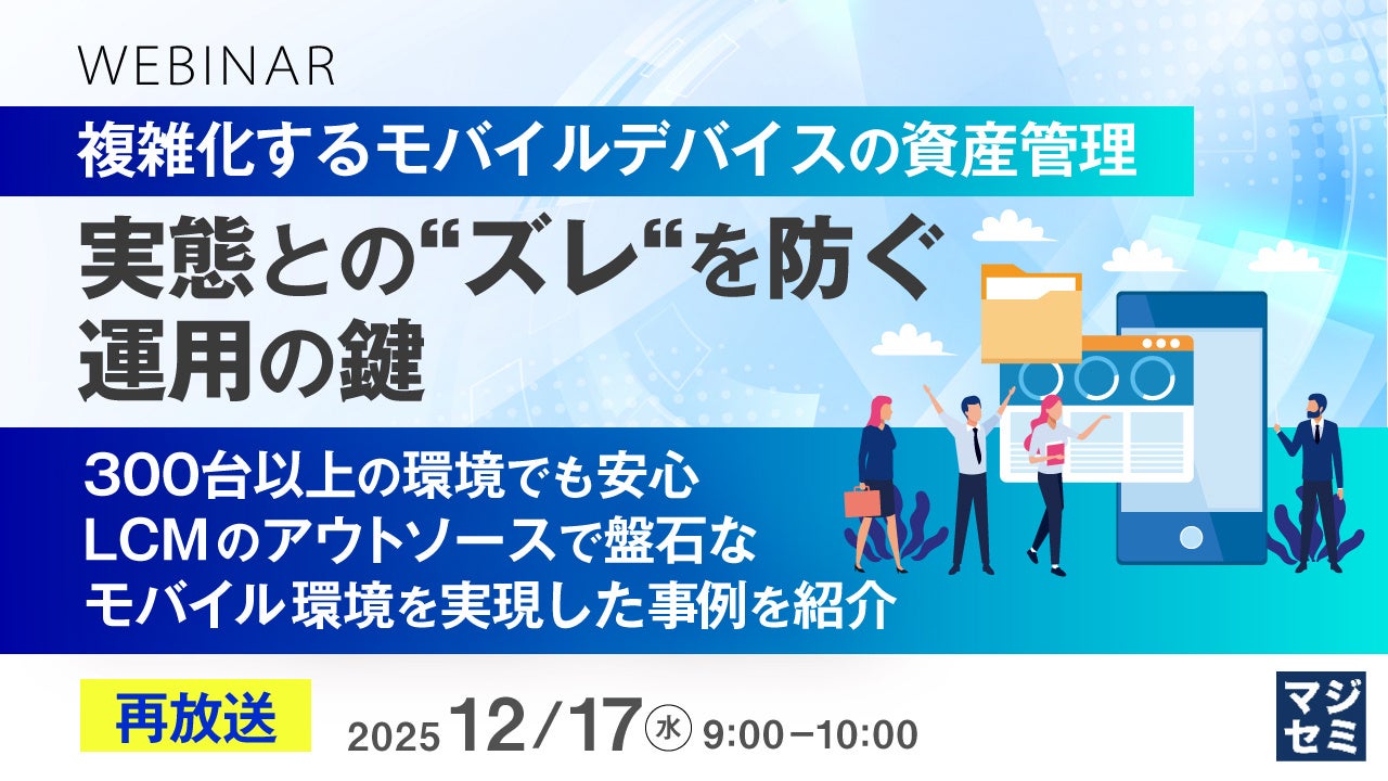 マジセミ株式会社は「【再放送】複雑化するモバイルデバイスの資産管理、実態との“ズレ“を防ぐ運用の鍵」というテーマのウェビナーを開催します。
