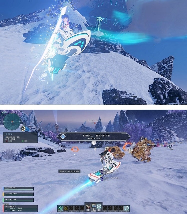 フィールド上に設置されている「ボードターミナル」にアクセスするとボードに乗ることができます。一気に加速する「フォトンスラスター」や、曲がりやすくなる「フォトンブレーキ」といった機能を使いこなし、銀世界を快適に冒険しましょう。