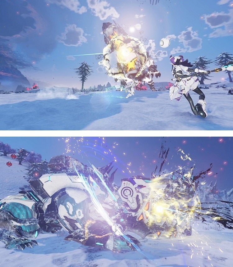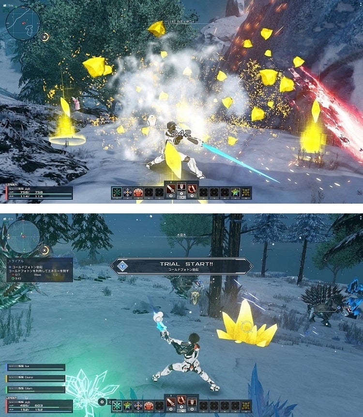 新しいトライアル「コールドフォトン励起」では、空中に現れる「コールドフォトン」に水晶氷片を当てることで大爆発が発生し、広範囲のエネミーに非常に大きなダメージを与え、ボスエネミーをダウンさせることも可能です。