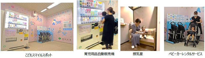 自動販売機で液体ミルクや紙おむつなどの育児用品を購入できるほか、授乳室を設けており、また、ベビーカーのレンタルサービスも受けられます。さらに、これらのサービスを、親しみをもってご利用いただけるよう、壁にパンダの親子のイラストを描くなど、可愛らしく装飾しています。