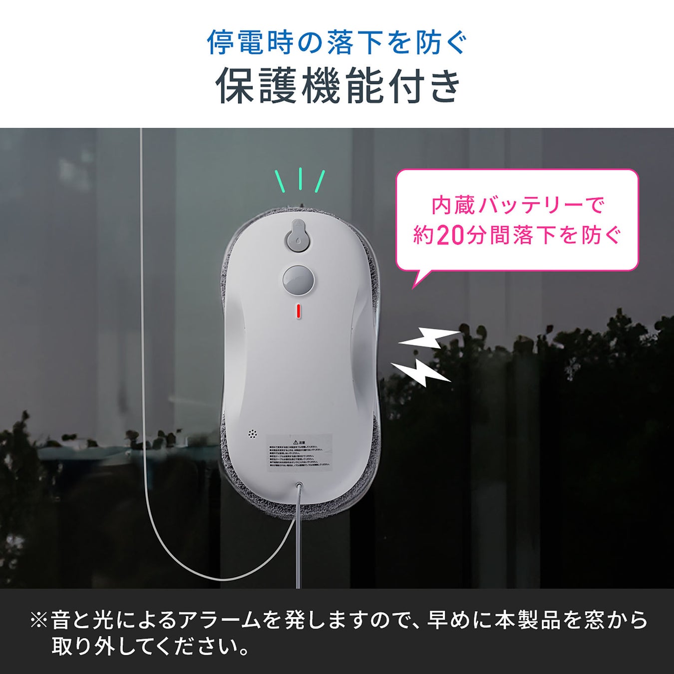 安全装置として、停電時の保護機能を搭載し、電源供給が止まっても内部バッテリーにより約20分間は窓に張り付いた状態をキープします。