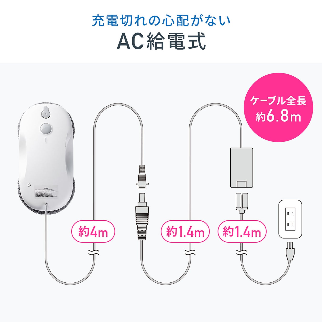 給電はACコンセントと電源アダプタは約2.8mあり、付属の延長ケーブル約4mと合わせることで、約6.8mの長さがあるので、ACコンセントの場所が遠くても安心できます。