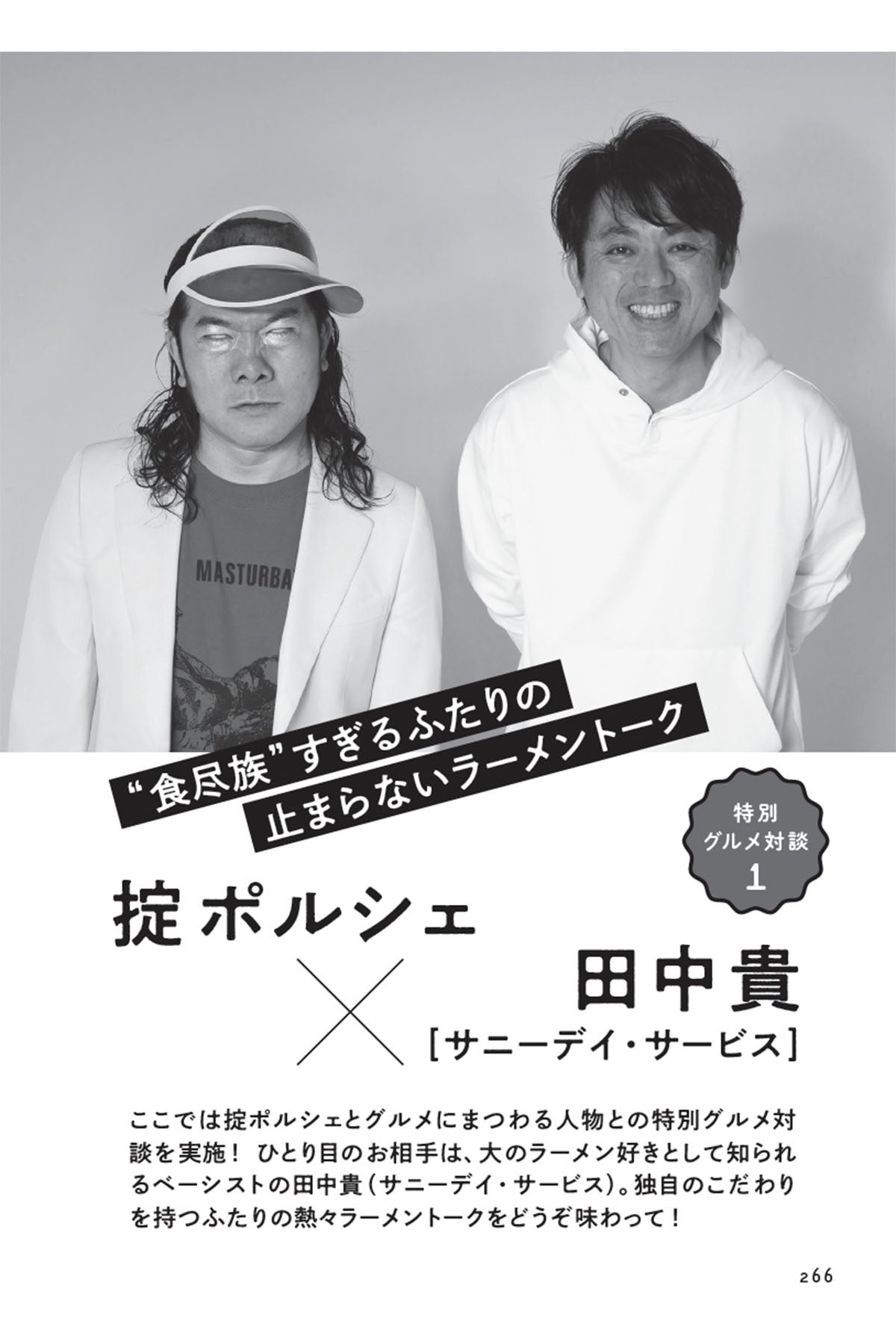 書籍限定の新録コンテンツとして、グルメにまつわる人物との特別対談も収録。対談相手はラーメン好きとしても知られ、メディアにも引っ張りだこのベーシスト・田中貴(サニーデイ・サービス)や、本書にも登場し、掟ポルシェが愛してやまないカレー店『かれーの店 うどん?』店主と個性豊か。ここでしか読めないトークが満載となっています。