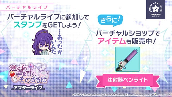 また、「迷い子の手を引く、そのさきは アフターライブ」の開催に先立ち、6月10日(金)からバーチャルショップにて、ペンライト「注射器ペンライト」を販売中です。