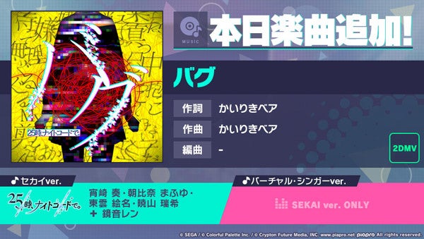 『プロジェクトセカイ カラフルステージ! feat. 初音ミク』かいりきベアさんの書き下ろし楽曲「バグ」を追加!