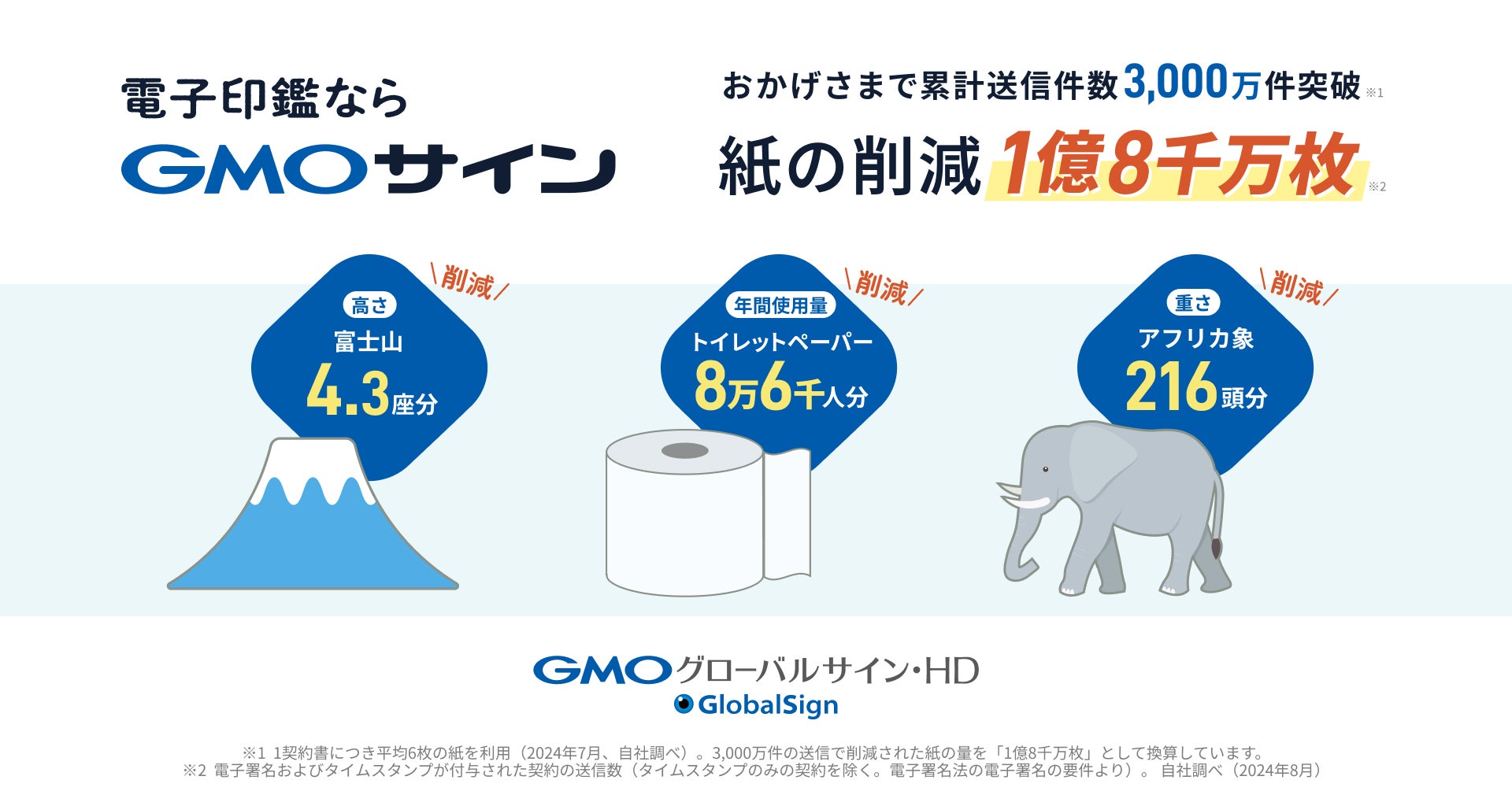 GMOグローバルサイン・ホールディングス株式会社(代表取締役:青山 満 以下、GMOグローバルサイン・HD)は、同社が開発提供する電子契約サービス「電子印鑑GMOサイン」(以下、「GMOサイン」)で締結する契約の累計送信件数が3,000万件を突破しました。これは、紙の契約書の場合積み上げた高さはおよそ富士山4.3座分に相当します。また、特設ページにてこれまでのペーパーレス化をわかりやすく可視化したインフォグラフィックスを公開します。