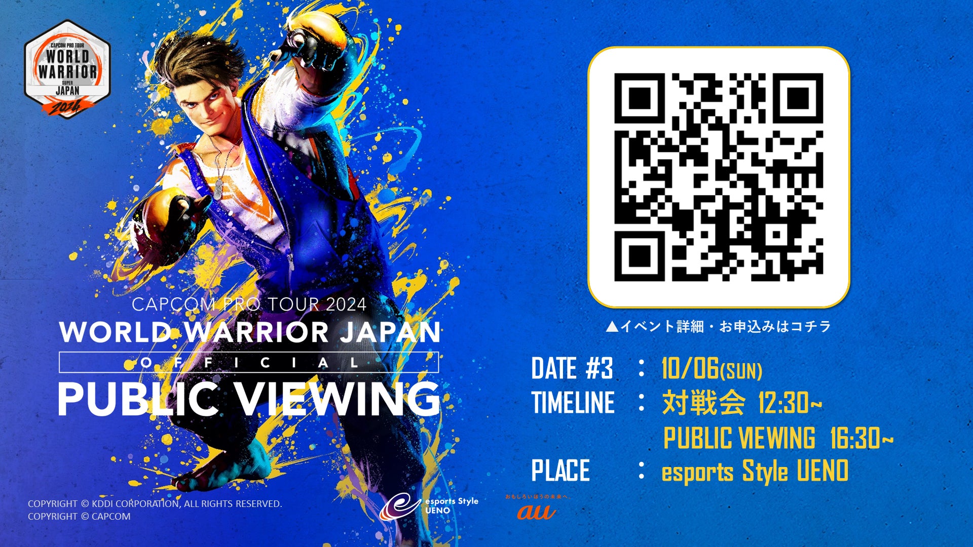 チケット詳細ならびに購入方法・販売期間などは、「CAPCOM Pro Tour 2024 ワールドウォリアー 日本大会 オフィシャルパブリックビューイング」特設サイト(https://esports.au.com/worldwarrior2024/ )もしくはesports Style UENO公式X(@au_esports_UENO)をご確認ください。