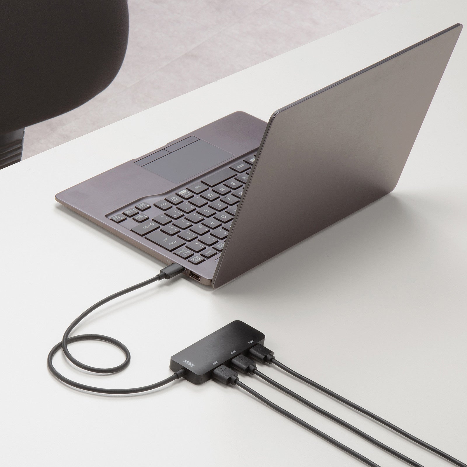 「AD-ALCMST3HD2」は、DisplayPort Altモード対応のType-Cポートから、HDMI×3ポートに映像・音声を出力できる変換アダプタです。