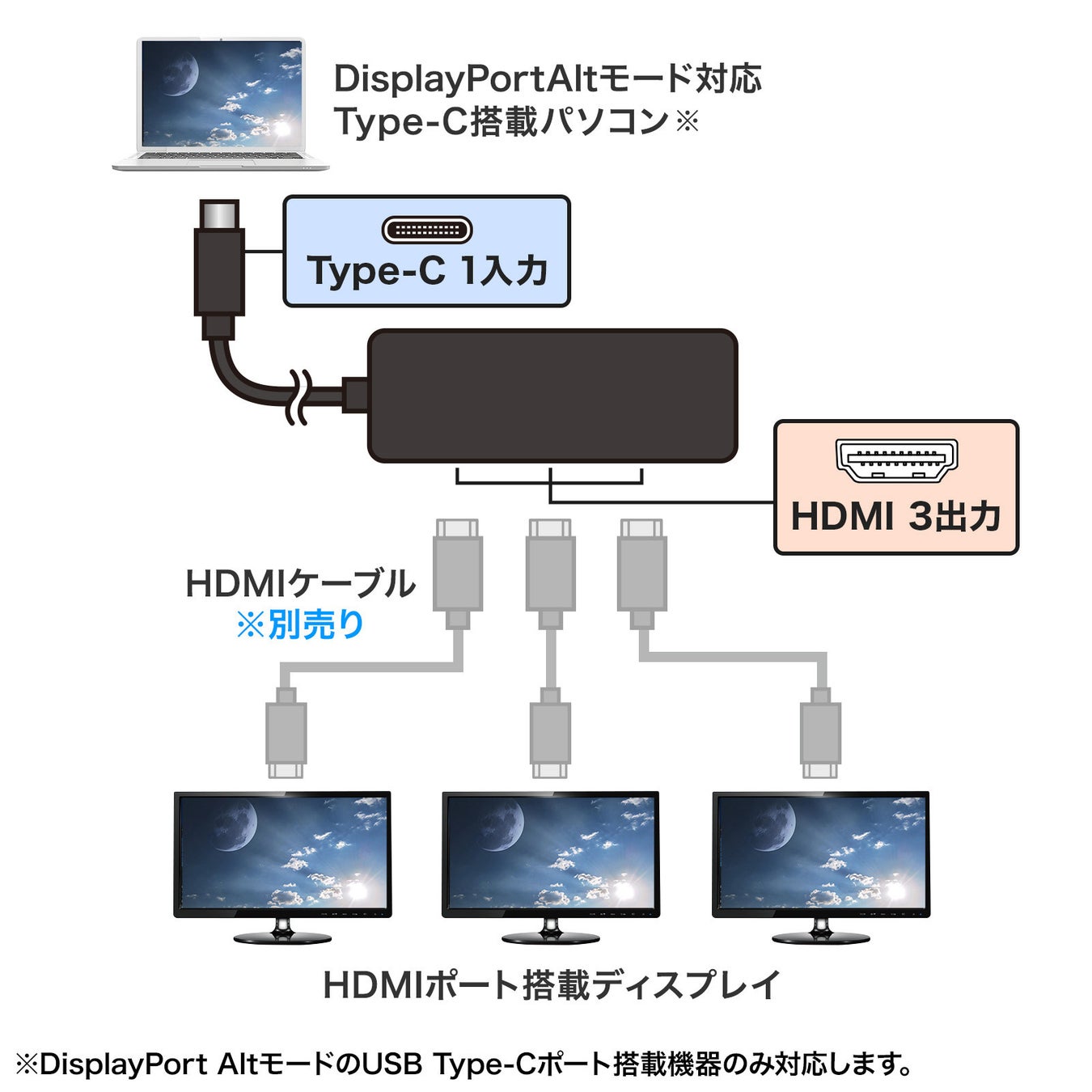 DisplayPort Altモードに対応したType-Cポートを備えたパソコンから、最大3台のHDMIディスプレイやテレビなどへ映像・音声を出力できます。ドライバなどのインストールは不要で、接続してすぐに使用できます。