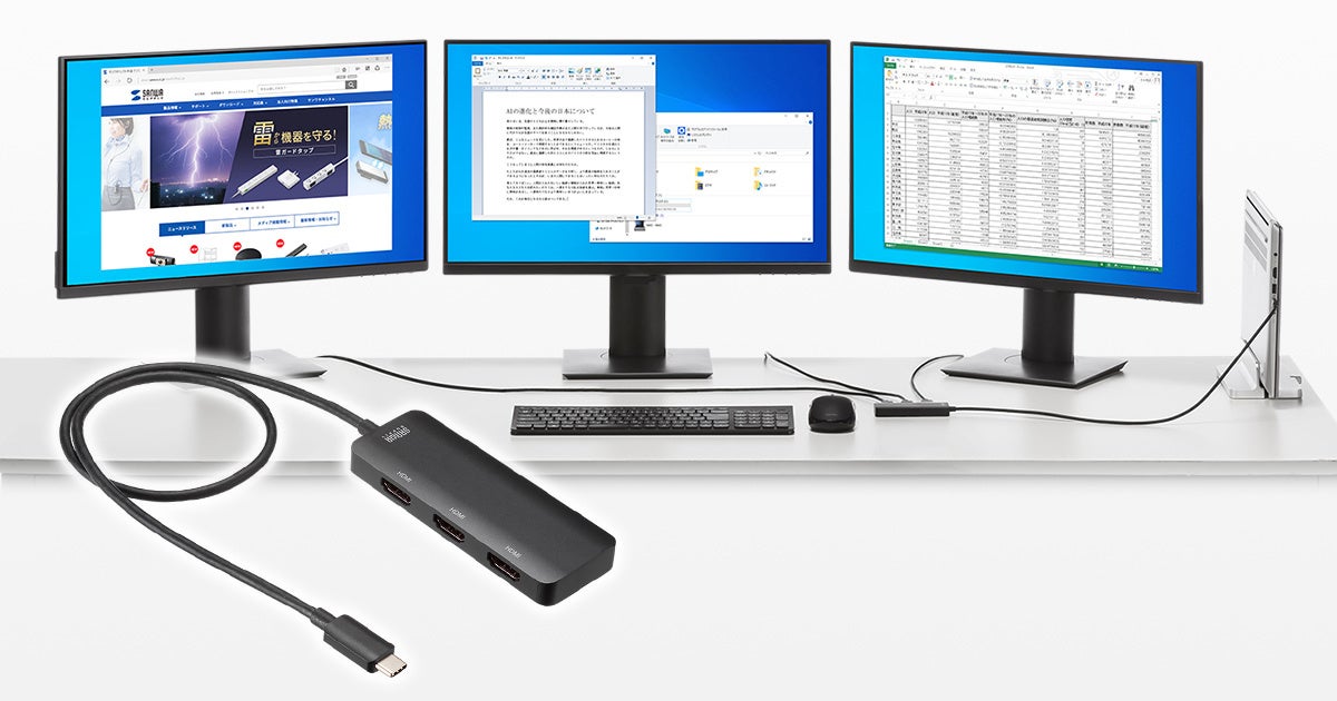 2〜3台のディスプレイへの拡張・複製出力に対応しています。ノートパソコンの画面を含めた場合、拡張・複製出力共に最大4画面への出力が可能です。(4K/30Hz×3+ノートパソコン画面)