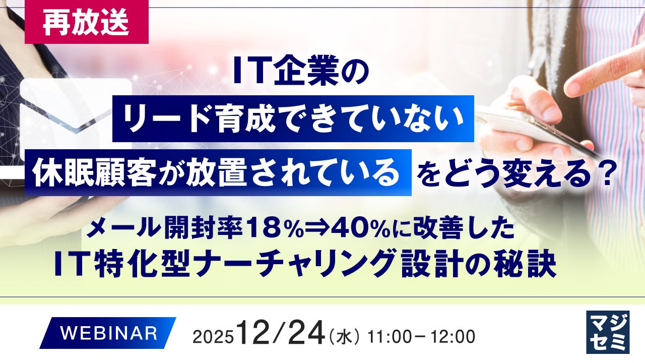 マジセミ株式会社は「【再放送】IT企業の「リード育成できていない」「休眠顧客が放置されている」をどう変える?」というテーマのウェビナーを開催します。