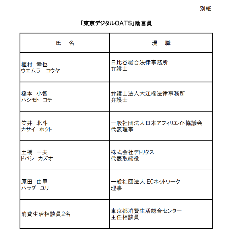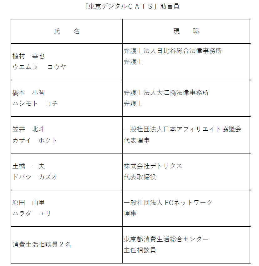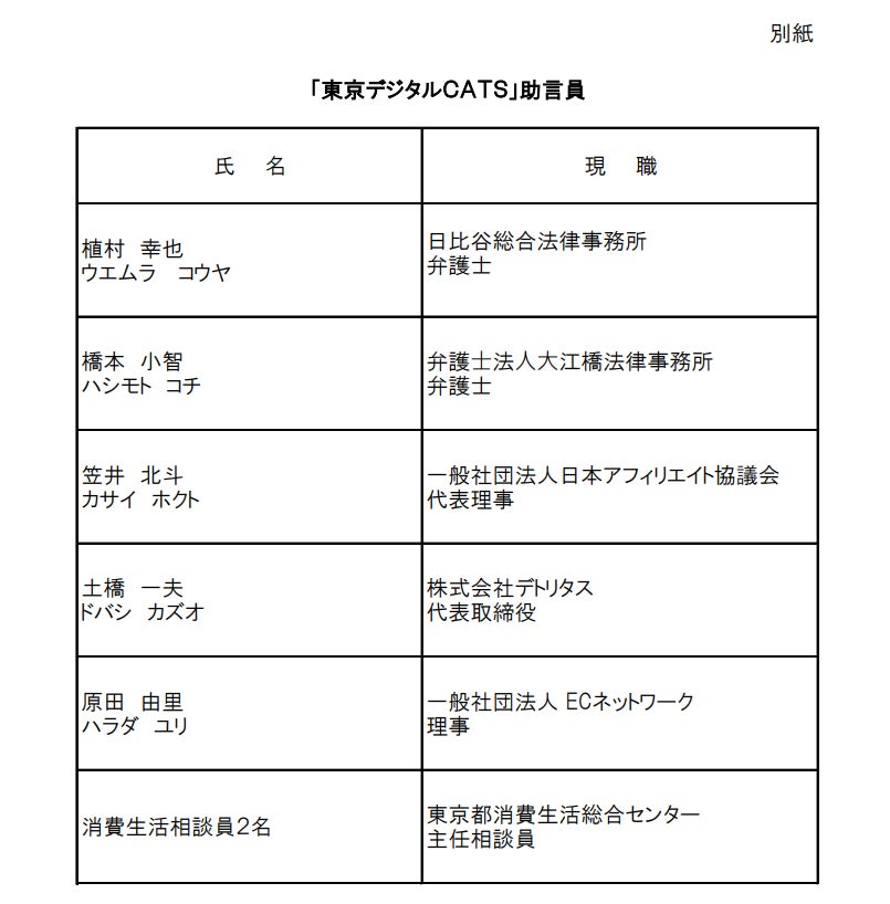 ■「東京デジタルCATS」助言員(弁護士、WEB専門家、消費生活相談員 (別紙の名簿)) ほか