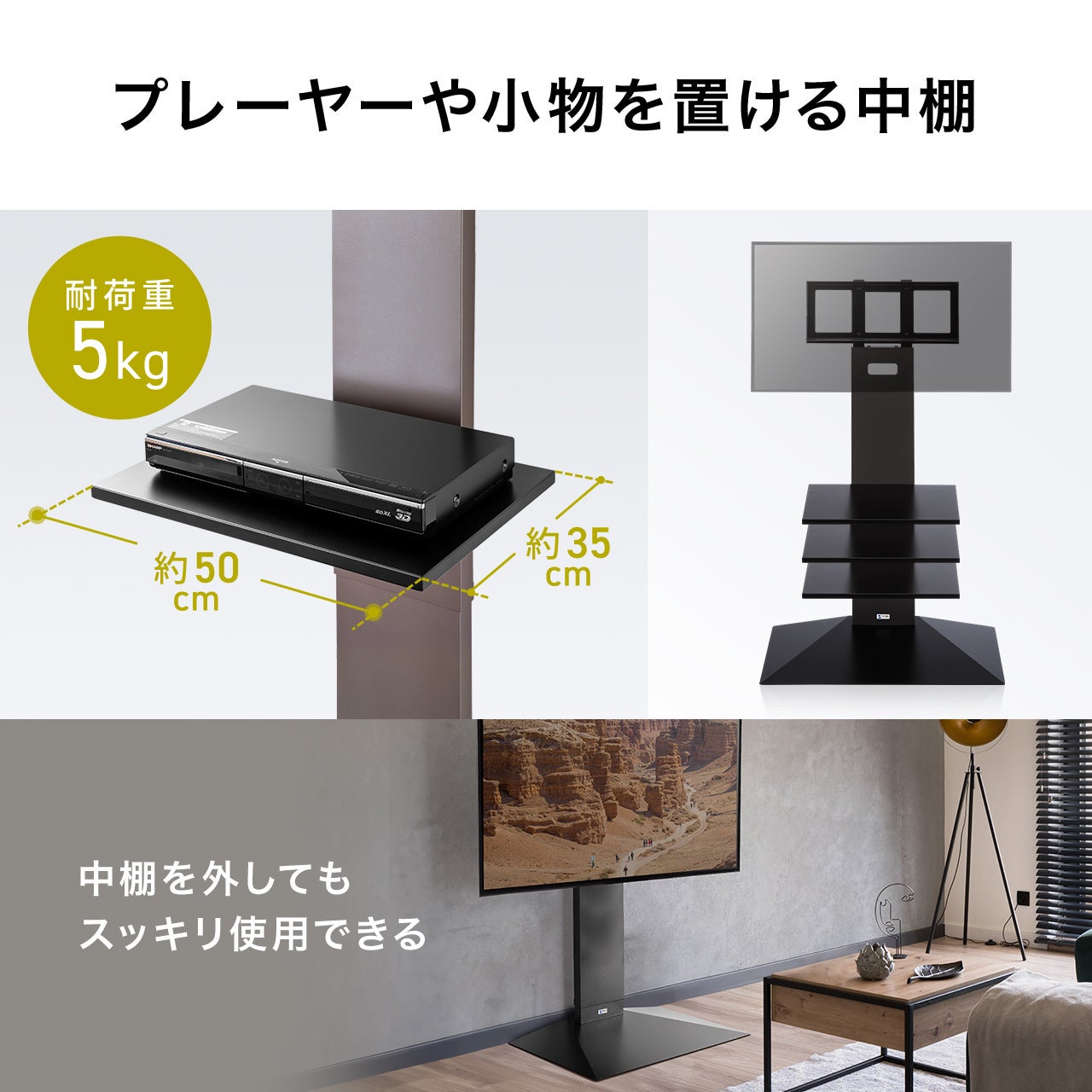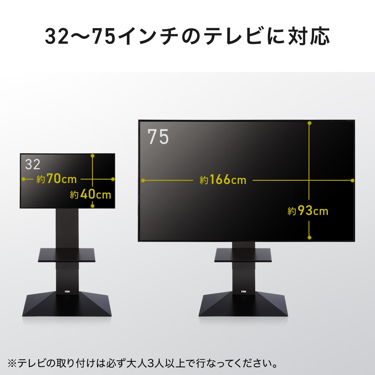 本製品は、32~75型までのテレビ/ディスプレイの搭載が可能なハイタイプの壁寄せテレビスタンドです。