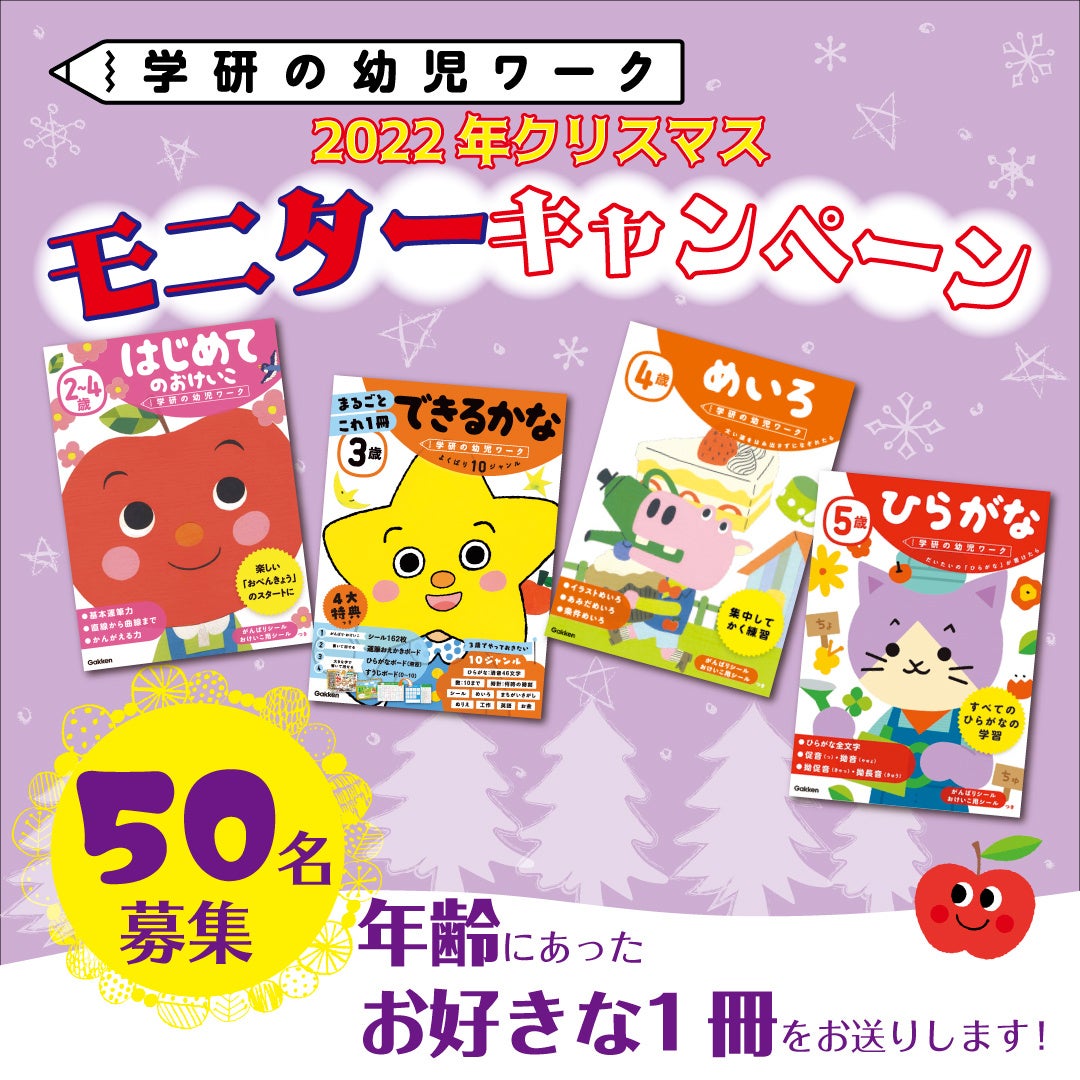 株式会社 学研ホールディングス(東京・品川/代表取締役社長:宮原博昭)のグループ会社、株式会社Gakken(東京・品川/代表取締役社長:五郎丸徹)は、2022年11月22日(火)よりInstagram「学研の幼児ワーク」2022年クリスマスモニターキャンペーンを実施いたします。
