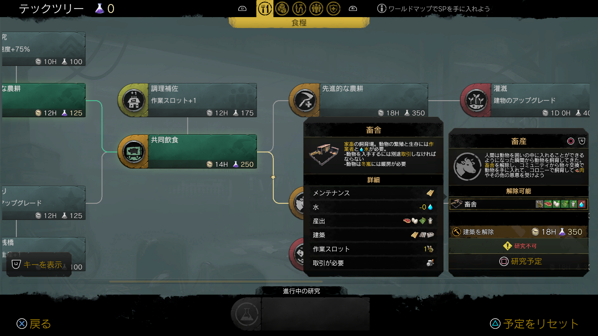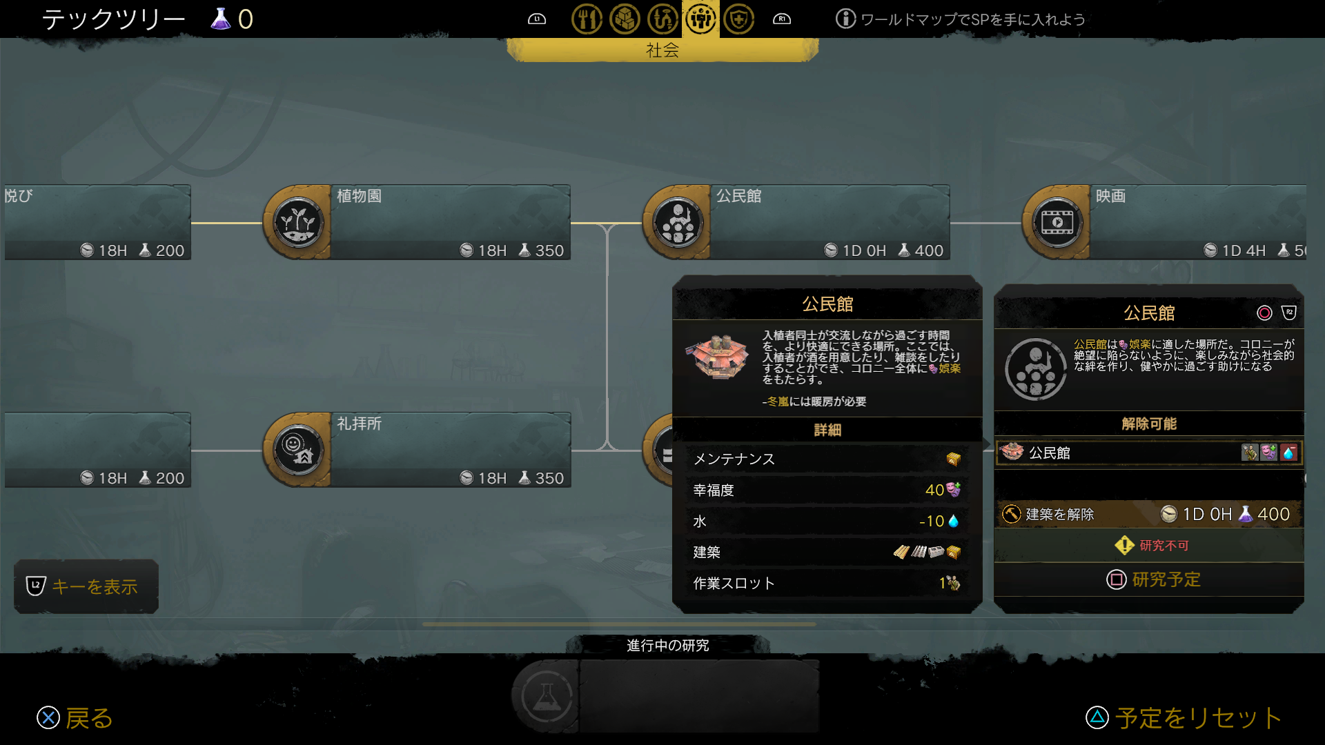 テックツリーはプレイスタイルの設定内容によって変化するため、新たにゲームを始めるたびに異なる展開を楽しむことが可能です。研究を重ねて、こだわりのコロニーを作り上げましょう!