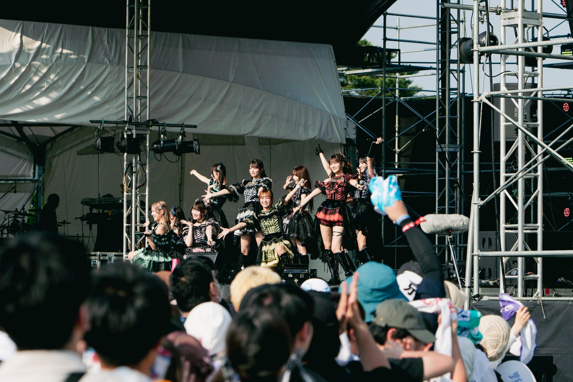 黒をベースにした衣装に身を包み、野外の特設ステージに登場。