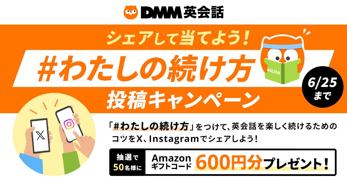 DMM英会話公式SNSアカウント(X、Instagram)をフォローし、「#わたしの続け方」のハッシュタグを添えて英会話を続けるコツを投稿した方の中から抽選で50名様に、Amazonギフトコード600円分をプレゼント!さらに、投稿後のエントリー&アカウント名フォーム入力で当選確率が2倍になります。ぜひこの機会にキャンペーンへご応募ください。