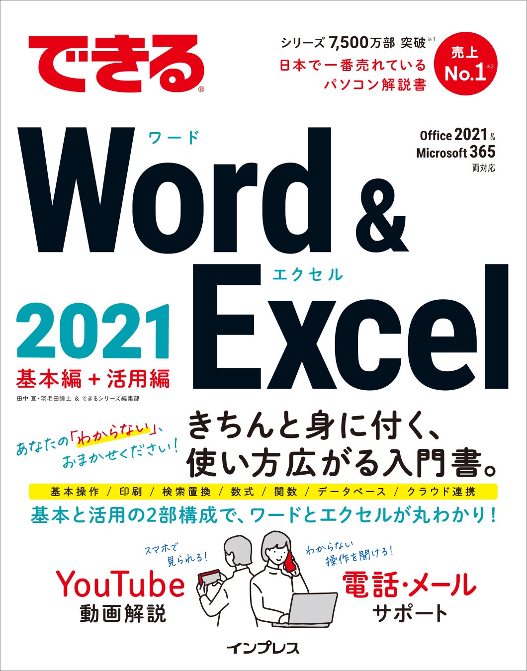 本書は4月1日に発売した『できるWord 2021』と『できるExcel 2021』から重要なレッスンをピックアップし、1冊の本として再構成しました。Wordについては基本編で文字の入力から印刷物の作成まで紹介し、活用編ではクラウドでの共同編集に触れています。また、Excelは基本編で数式やグラフの作成方法を学び、活用編で最新の関数を使った業務効率化まで説明しています。さらにWord&Excel編では、アプリを連携させて使う方法を紹介しています。各章は独立した形になっているので、知りたい操作や気になるテーマから読み進めることができます