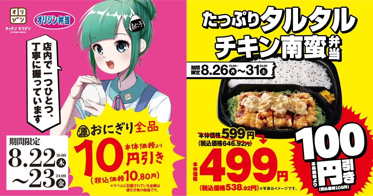 弁当・惣菜専門店「キッチンオリジン」「オリジン弁当」を展開しているイオングループのオリジン東秀株式会社(本社:東京都調布市/代表:後藤 雅之)は、8月22日(木)10時~23日(金)「源おにぎり全品10円引き」、8月26日(月)10時~31(土)「たっぷりタルタルチキン南蛮弁当、100円引きの499円」期間限定セールを実施いたします。※イオン、ダイエー、カスミ各店の店舗は除きます。