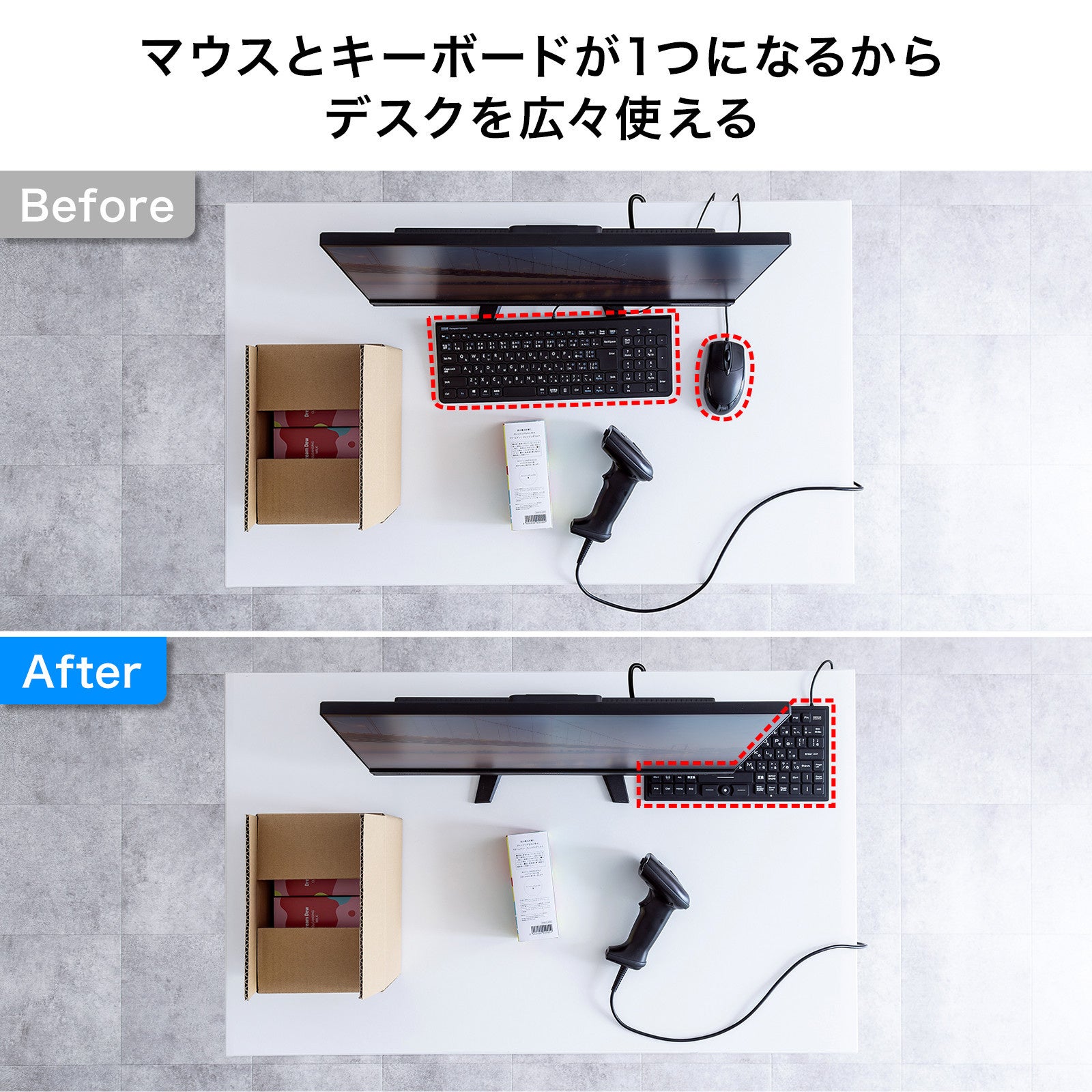 テンキー部分を省いたコンパクト設計です。さらに、ポインター機能を搭載しているので、マウスなしでマウスカーソル操作でき、省スペースでの作業が可能です。デスク上を広く使えて作業効率が上がります。