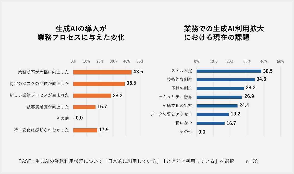 生成AIの導入が業務プロセスに与えた影響について複数回答にてたずねたところ、「業務効率が大幅に向上した」の回答率が43.6%、「特定のタスクの品質が向上した」が38.5%と高く、生成AIが単純作業や反復的なタスクの自動化・迅速化、およびプロセスの正確性や一貫性の向上に寄与している可能性を示唆しています。