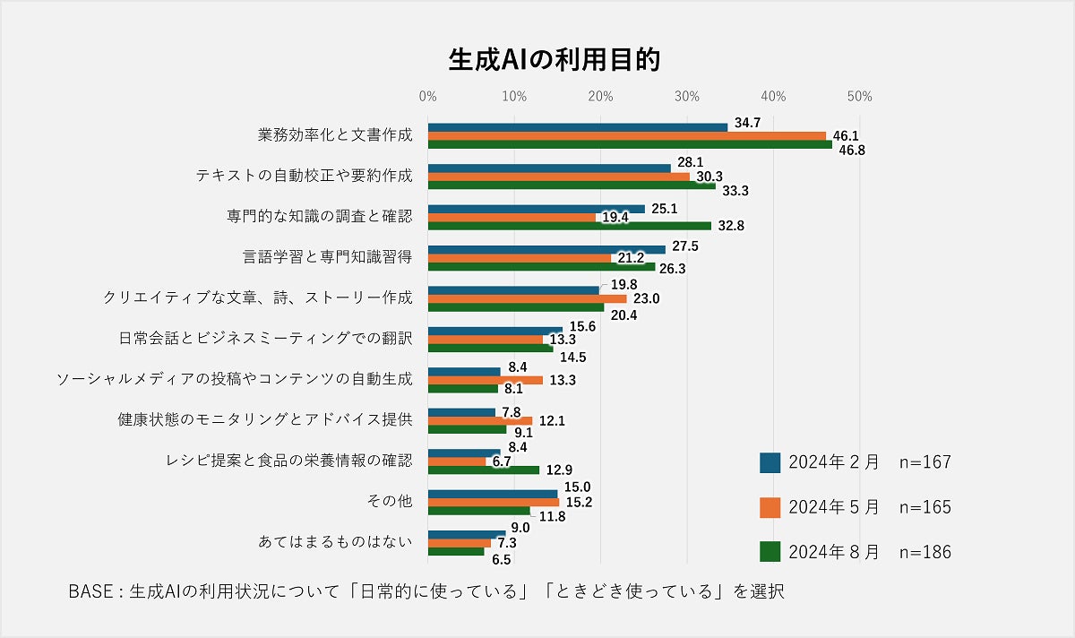 また、期間全体での変化が最も大きかったのは、「業務効率化と文書作成」であり、34.7%から46.8%へと12.1ポイント上昇しました。次いで、「専門的な知識の調査と確認」では25.1%から32.8%へと7.7ポイント増加しました。これらの結果から、業務効率化や文章作成支援ツールとしての地位を確立しつつある一方で、専門知識の調査など、新たな可能性も模索されている段階にあると言えるでしょう。