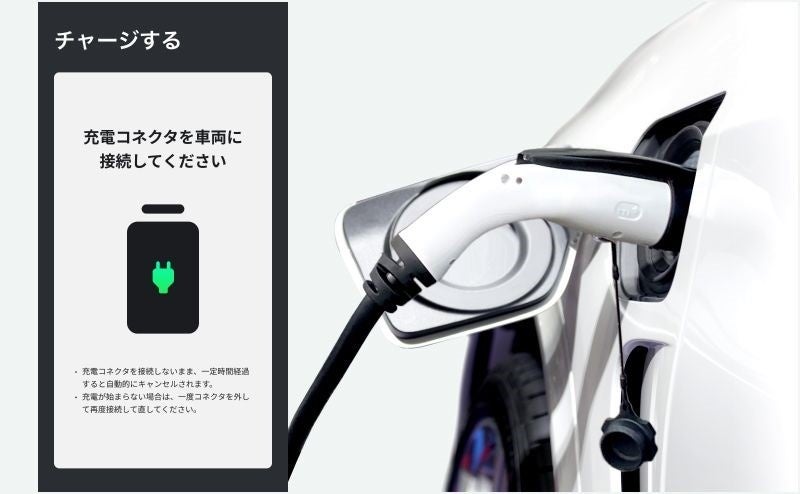 DMM EV CHARGE充電器のQRコードを読み取った後、充電器のコネクタを車に接続し、充電開始ボタンを押すと充電が開始される。