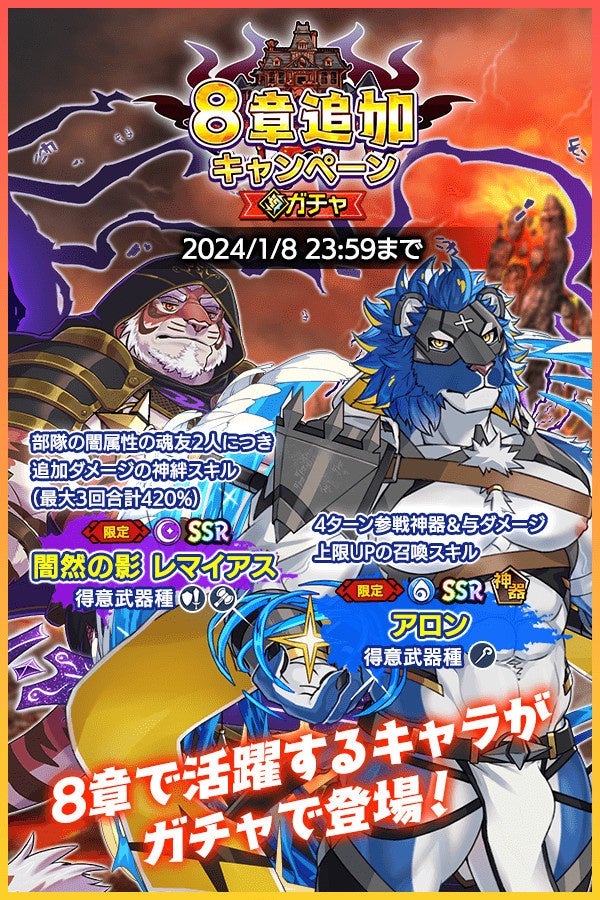 SSR魂友「闇然の影 レマイアス」とSSR神器「アロン」、そして7章に登場したSSR魂友「ヴァスハーン」、SSR神器「愛心惑う エクスカリバー」もピックアップされた「8章追加キャンペーンガチャ」もお見逃しなく。