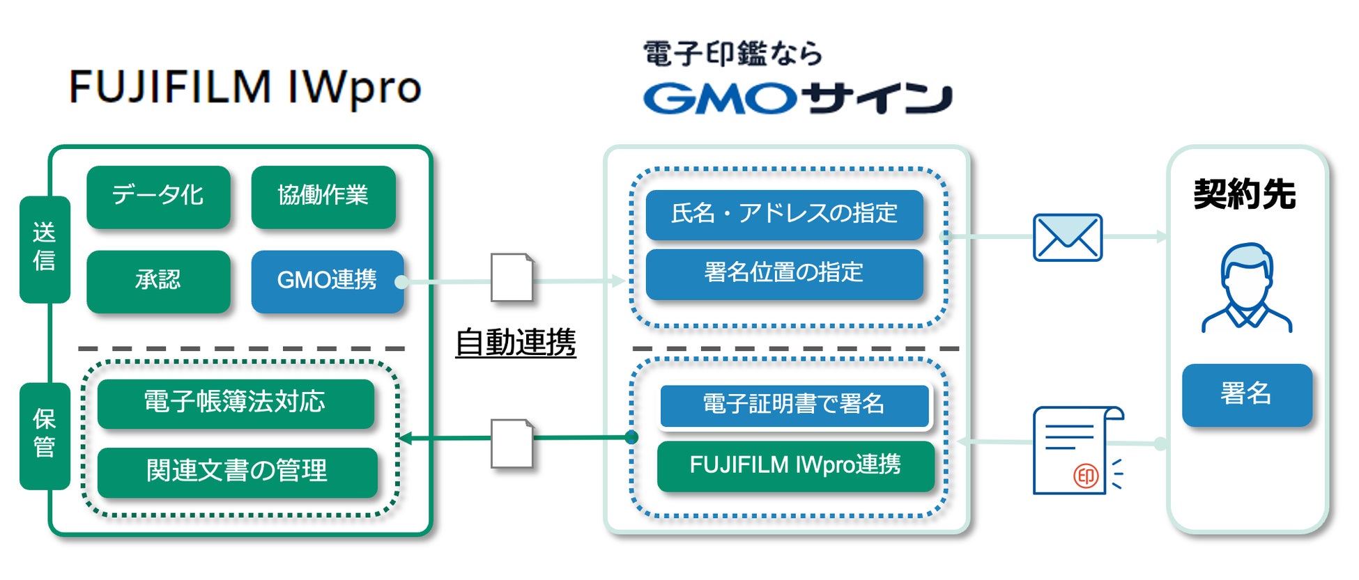 2024年9月19日より「FUJIFILM IWpro」と「GMOサイン」が連携することで、「FUJIFILM IWpro」のワークフローで決裁が完了した文書情報をスムースに「GMOサイン」へ取り込み、電子契約の締結後には文書を自動的に「FUJIFILM IWpro」へ保存できるようになります。