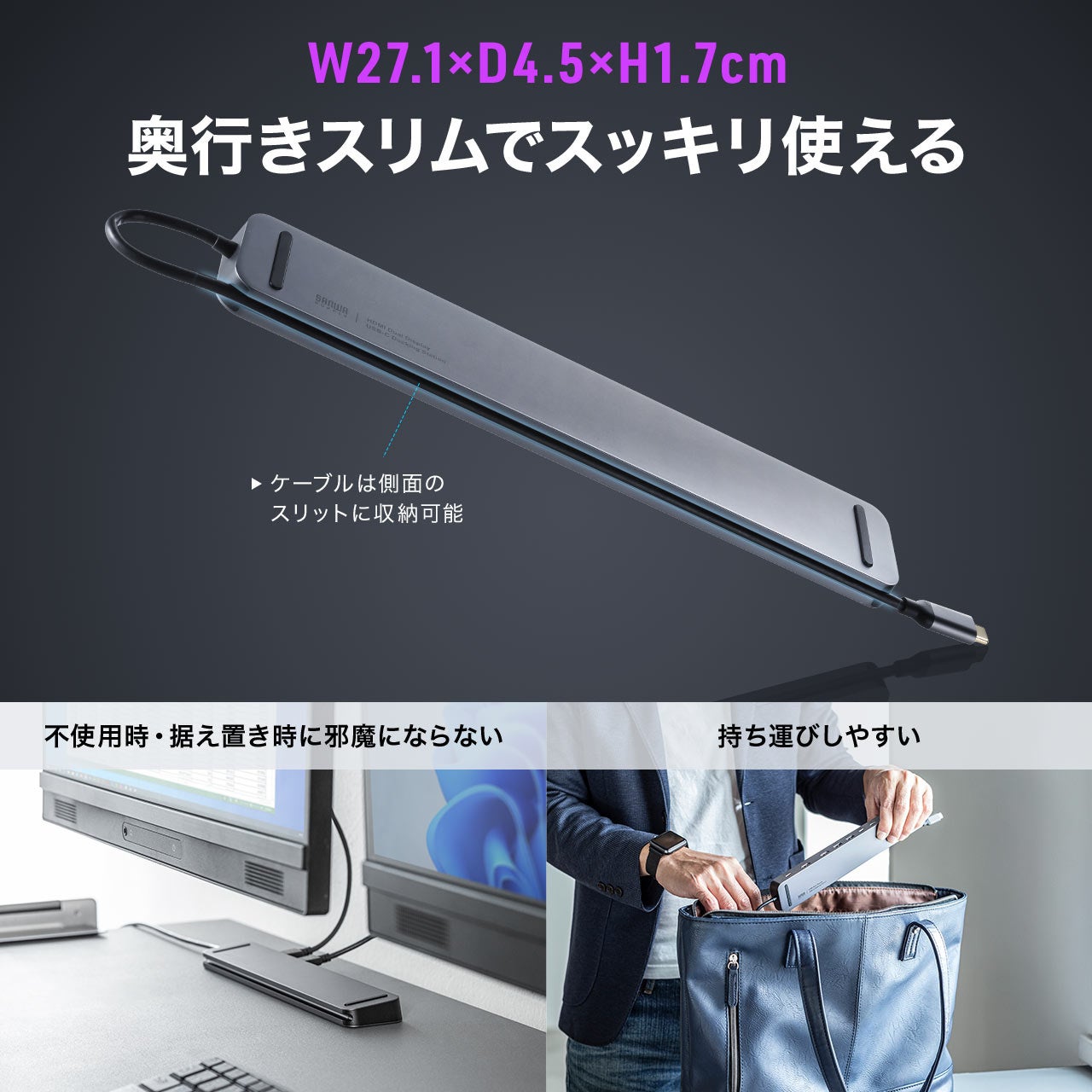 本製品は、USB Type-Cケーブル1本でディスプレイ最大2台へ4K映像出力ができる、HDMI映像出力端子を2ポート搭載したUSB Type-Cドッキングステーションです。映像出力の他に、各種USBデバイス、有線LAN、オーディオの接続にも対応します。自宅やオフィスなどではType-Cケーブル1本の接続で大画面ディスプレイとUSBデバイスで快適に操作し、外出や会議など移動時にはType-Cケーブル1本を抜くだけでさっとパソコンを持ち運ぶことができます。