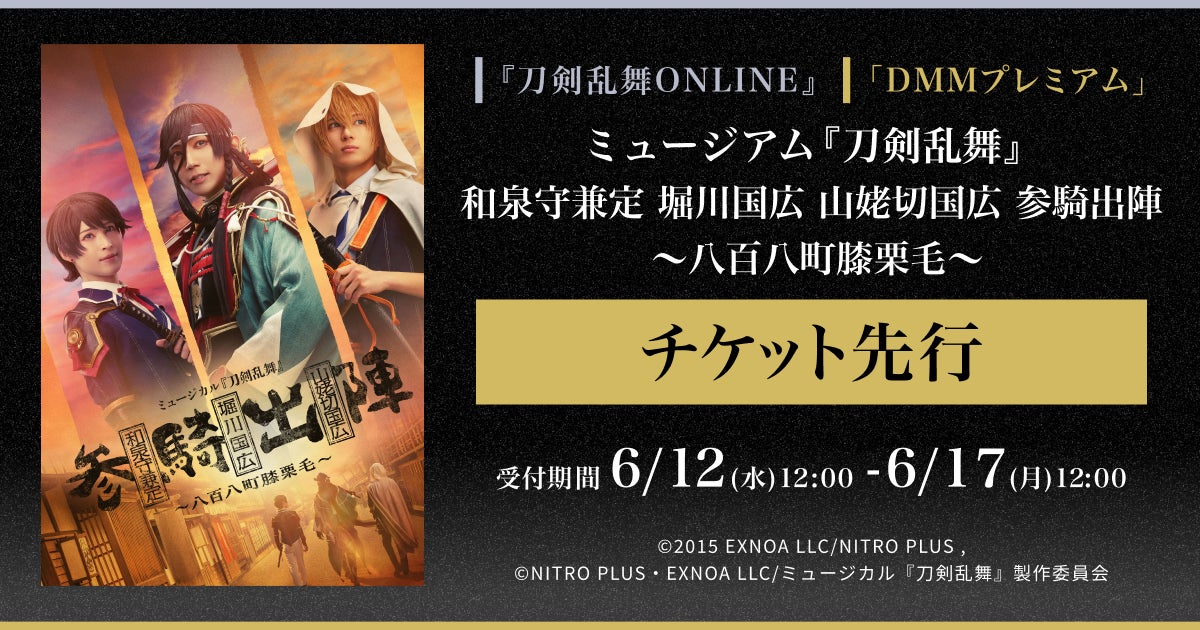 合同会社DMM.com(本社:東京都港区、会長 兼 CEO 亀山敬司、https://dmm-corp.com/ 以下DMM )は、DMMグループの合同会社EXNOAが開発・運営、株式会社ニトロプラスが世界観・シナリオ・キャラクターデザインを担当している刀剣育成シミュレーション『刀剣乱舞ONLINE』を原案とする「ミュージカル『刀剣乱舞』 和泉守兼定 堀川国広 山姥切国広 参騎出陣 ~八百八町膝栗毛~」につき、『刀剣乱舞ONLINE』ゲーム内チケット先行ならびに、月額550円(税込)で総合動画配信サービス「DMM TV」の見放題作品視聴やDMMの各種サービスをお得に利用できる「DMMプレミアム」の会員向けチケット先行の申し込み受付を開始いたしました。