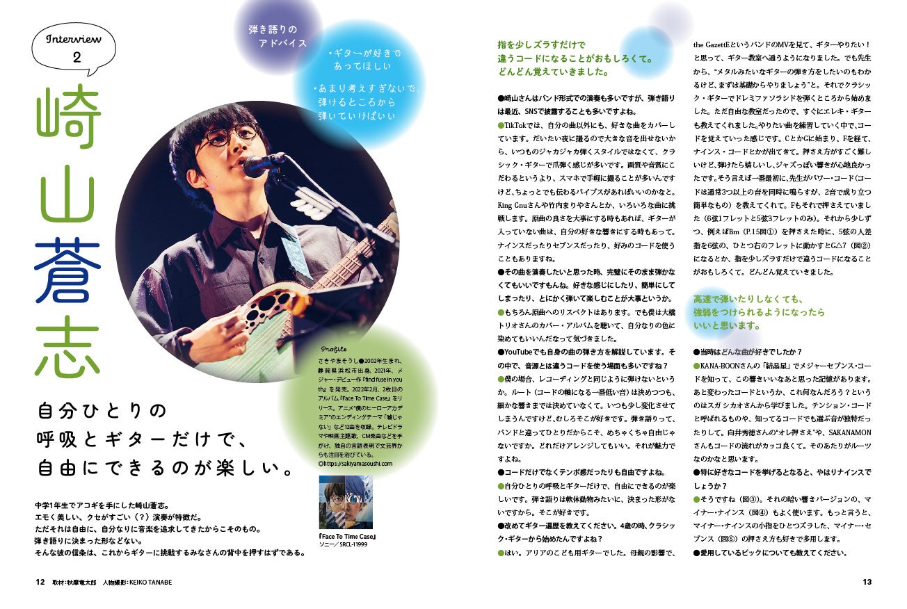 そのために、大石昌良、森山直太朗、須田亜香里(SKE48)などのアーティスト・インタビュー、ポイントを厳選した弾き方講座、オススメの製品紹介、15曲の弾き語りスコア集を掲載しています。スコア集は一般的な譜面と違い、原曲の良さを生かしながら、初心者が押さえやすいアコギ的コード・フォームを選んであります。ぜひ本書を片手に、アコギ・ライフを楽しんでください!
