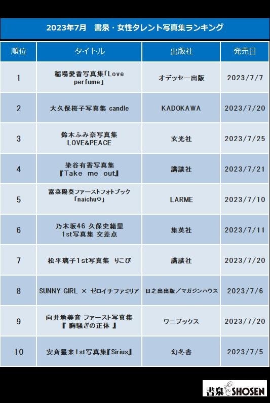 株式会社書泉(アニメイトグルーiプ)は、「アイドルイベントの聖地」と呼ばれる書泉ブックタワー含む書泉店舗においての2023年7月の「女性タレント写真集売上ランキング」を発表いたします。