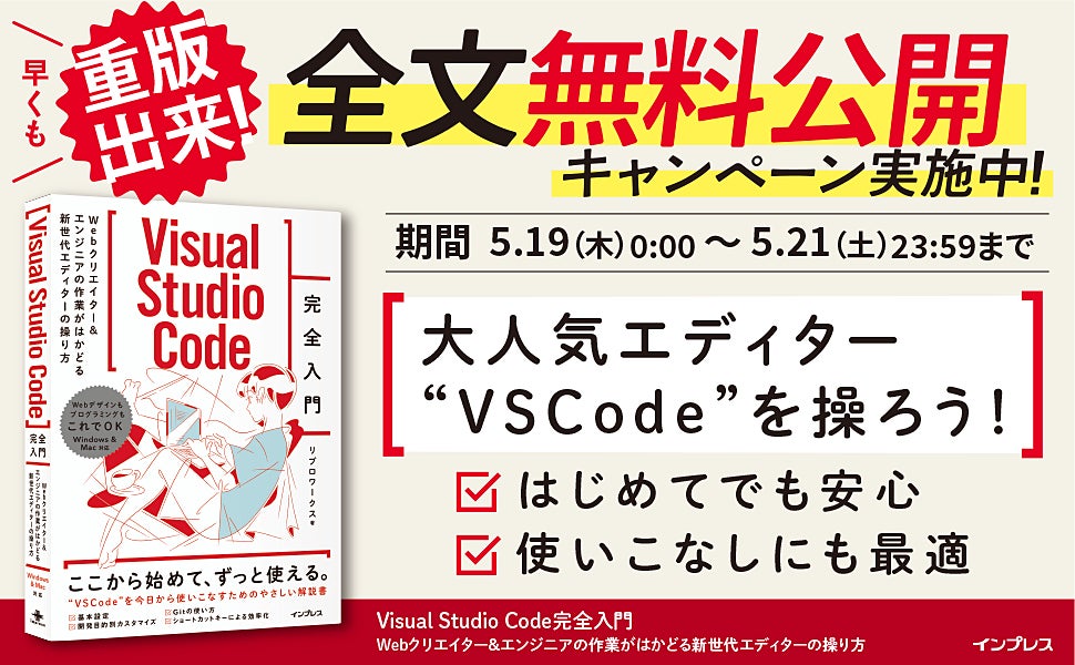 インプレスグループでIT関連メディア事業を展開する株式会社インプレス(本社:東京都千代田区、代表取締役社長:小川 亨)は、『Visual Studio Code完全入門 Webクリエイター&エンジニアの作業がはかどる次世代エディターの操り方』の重版出来を記念して、5月19日(木)~5月21日(土)の3日間限定で本書の全文を無料公開するキャンペーンを実施します。